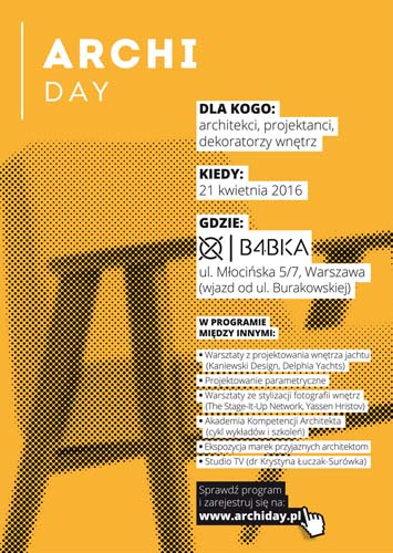Formuła wydarzenia łączy zalety konferencji, warsztatów, wystaw, targów i szkoleń. Uczestnicy archiDAY otrzymają ogromną dawkę wiedzy merytorycznej i praktycznej. Spotkanie odbędzie się 21 kwietnia 2016 r. w godz. 9:00 - 20:00 w przestrzeni kreatywnej „Babka” w Warszawie, przy ul. Młocińskiej 5/7.