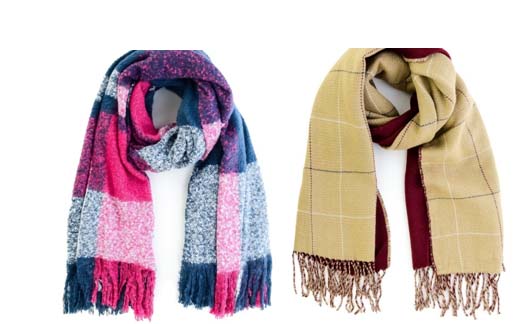 Fot. Prima Moda. Wykończone frędzlami damskie szaliki na zimę w modną w tym sezonie kratę.
