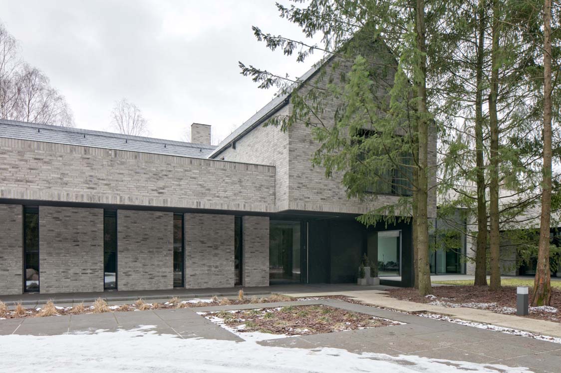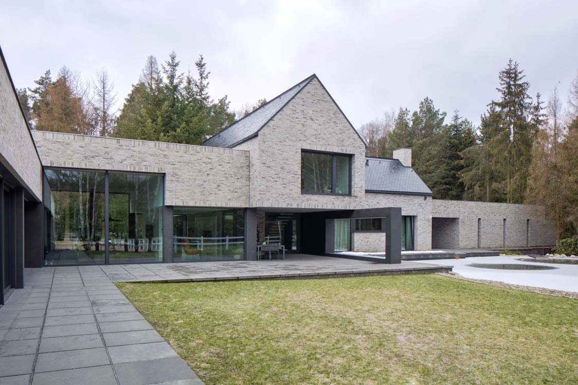 Wykończenie domu miało być trwałe, archaizujące i doskonale komponujące się z terenem, jak mówi architekt „bez zbędnego poklasku czy zwracania na siebie uwagi”. Doskonałym wyborem okazał się dobór szarej cegły z przebarwieniami, której „dzikie” ułożenie zamaskowano maksymalnie zbliżonym do cegły kolorem fugi. Dach budynku tradycyjnego pokryty został łupkiem w kolorze czarnym w myśl wykorzystywania naturalnych elementów. Dom pomimo nowoczesnego i odważnego kształtu posiada wykończenia z cegły nad oknami w formie rolki oraz na attykach i zakończeniach nawisów, które idealnie implementują architekturę polską, tradycyjną, w nowoczesną, dynamiczną i bryłową architekturę XXI wieku.