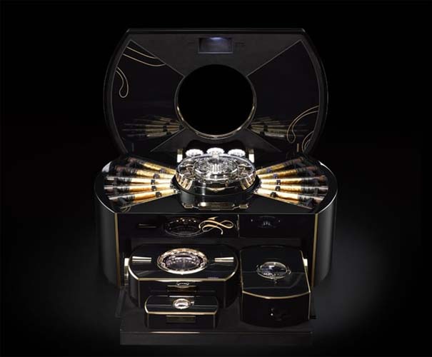 Jedno pudełko składa się z ponad 2600 części, które połączone tworzą prawdziwe dzieło sztuki. Specjalny czujnik informuje, ile aktualnie znajduje się w środku cygar, a w sumie jedna skrzynka pomieści 24 egzemplarze. W centralnym punkcie znajduje się luksusowy zegarek, złożony z 323 części.