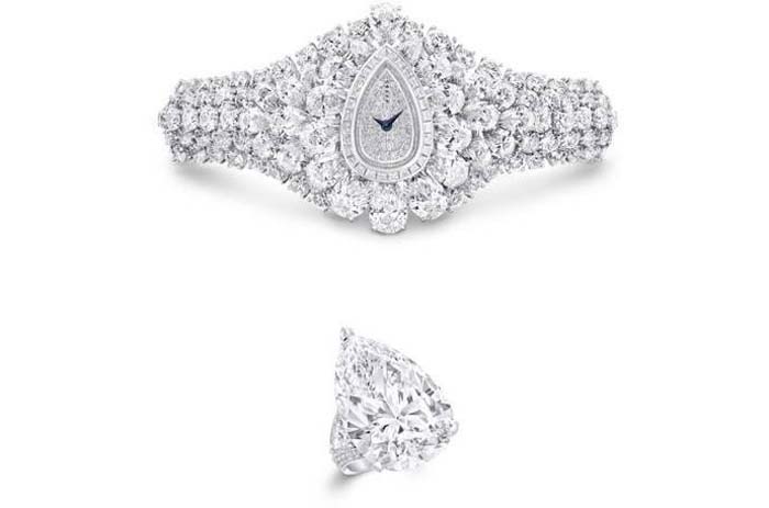 Najdroższy zegarek świata posiada wiele białych diamentów o jakości niemal 153 karatów, oraz 38-karatowy diament w szlifie gruszkowym, który służy jednocześnie za tarczę ze wskazówkami. Zegarek przede wszystkim spełnia swoją główną funkcję – pokazuje i mierzy czas, ale z łatwością można zamienić go również w oszałamiający pierścionek czy bransoletkę.