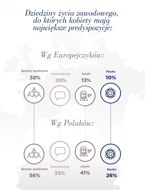 Mieszkańcy Europy widzą miejsce dla kobiet w nauce, a wolne tempo zmian w tym obszarze jest dla nich zaskakujące. Zastanawiające jest jednak to, że jedynie 10 proc. badanych Europejczyków wskazało właśnie naukę, jako dziedzinę, w której kobiety mają najlepsze predyspozycje do osiągnięcia sukcesów. Znacznie częściej wskazywane były: sprawy społeczne (38 proc.), komunikacja (20 proc.) oraz języki (13 proc.). Wyniki z Polski wypadają lepiej, bo naukę jako obszar zawodowego spełnienia dla kobiet wybrało ponad dwukrotnie więcej osób (26 proc.) niż wynosi średnia dla badanych krajów europejskich. Na wcześniejszych miejscach znalazły się takie dziedziny, jak sprawy społeczne (56 proc.), języki obce (41 proc.) i komunikacja (33 proc. ankietowanych z Polski).