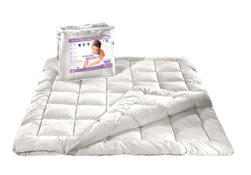 Kołdra 4 pory roku to model składający się z dwóch części – letniej i wiosenno-jesiennej. Po ich złączeniu zyskujesz z kolei ciepłe okrycie zimowe. Na zdjęciu model Medical AMW. Źródło: sklep internetowy Karo Warszawa.