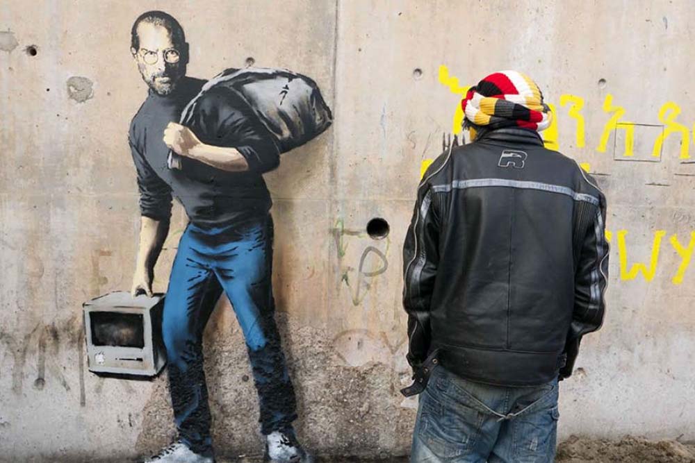Przedstawił na nim założyciela Apple – Steve’a Jobsa – ucharakteryzowanego na uchodźcę. Graffiti znajduje się na ścianie w Calais – obozie imigrantów w północnej Francji.