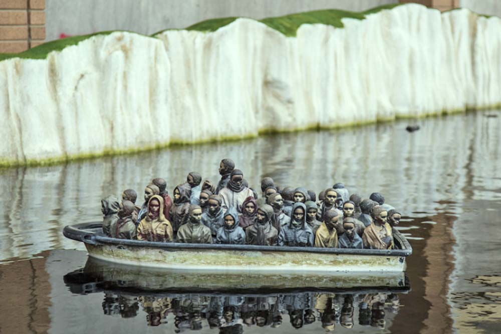 Z kolei trzeci mural Banksy’ego stanowi czarno-białą reprodukcję słynnego obrazu Tratwa Meduzy, który wyszedł spod pędzla Theodore Gericaulta. Przedstawia on ocalałych rozbitków na trawie, którzy desperacko próbują zwrócić uwagę załogi statku znajdującego się na horyzoncie. Banksy na swojej stronie internetowej zamieścił zdjęcie tego dzieła z komentarzem: „Nie wszyscy płyniemy na tej samej łodzi.”