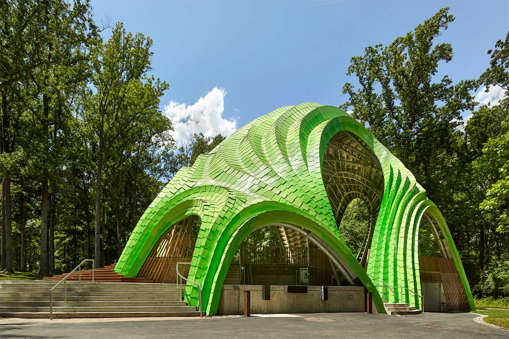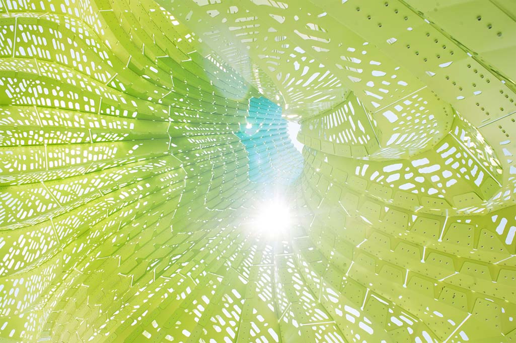 Aluminiowa struktura wykonana z 582 elementów utrzymuje się stabilnie dzięki wykorzystaniu odpowiednio dużej ilości nitów. Każda z części jest perforowana, więc światło może przez nie przenikać, co daje zamierzony, wizualny efekt.