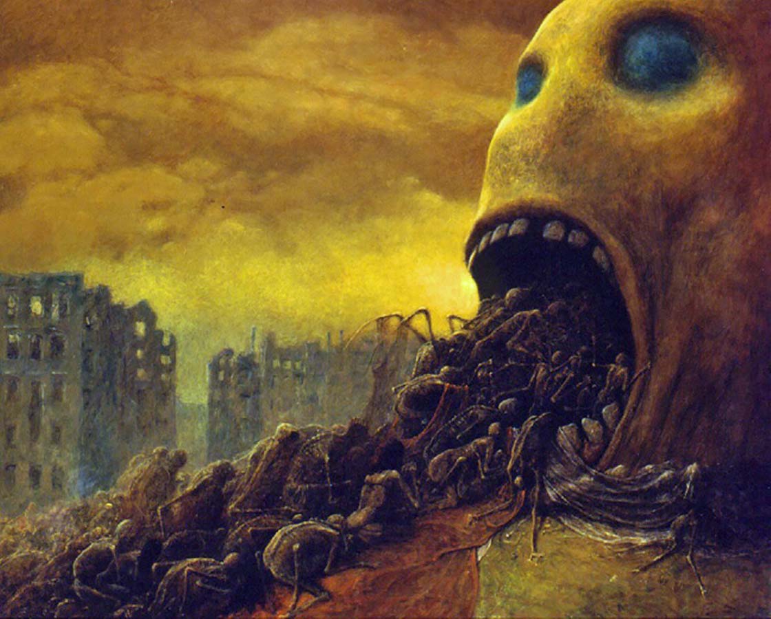 Nigdy się nie dowiemy, co kryło się w przerażającym ale i genialnym umyśle Beksińskiego. Kiedy patrzymy na jego obrazy, najczęściej odczuwamy niepokój. Ale jest to dobry niepokój, który nas wyzwala, sprawia, że czujemy się wolni, bo nic gorszego nie może się już stać. Jeśli przerażona może być nawet śmierć, to i my możemy pozwolić sobie na ten luksus. Jeden z najtrafniejszych obrazów Beksińskiego jest „Pełzająca śmierć”. Spersonifikowana Śmierć jest przedstawiona jako istota przerażona. Na pierwszym planie dostrzegamy homoidalny stwór, którego pająkowate nogi pełzną bezsilnie po spalonej ziemi. Ma się wrażenie, że sama śmierć jest zaskoczona ogromem zniszczeń. W tle widać płonące miasto, ruiny, odłamki nie wiadomo do końca czego. Zniszczenie jest najprawdopodobniej efektem wojny, bo przecież jej obraz malarz nosił ze sobą przez całe życie. Ale nie chodzi tu tylko o drugą wojnę, ale każdą, która niszczy człowieka i cywilizację, którą stworzył.