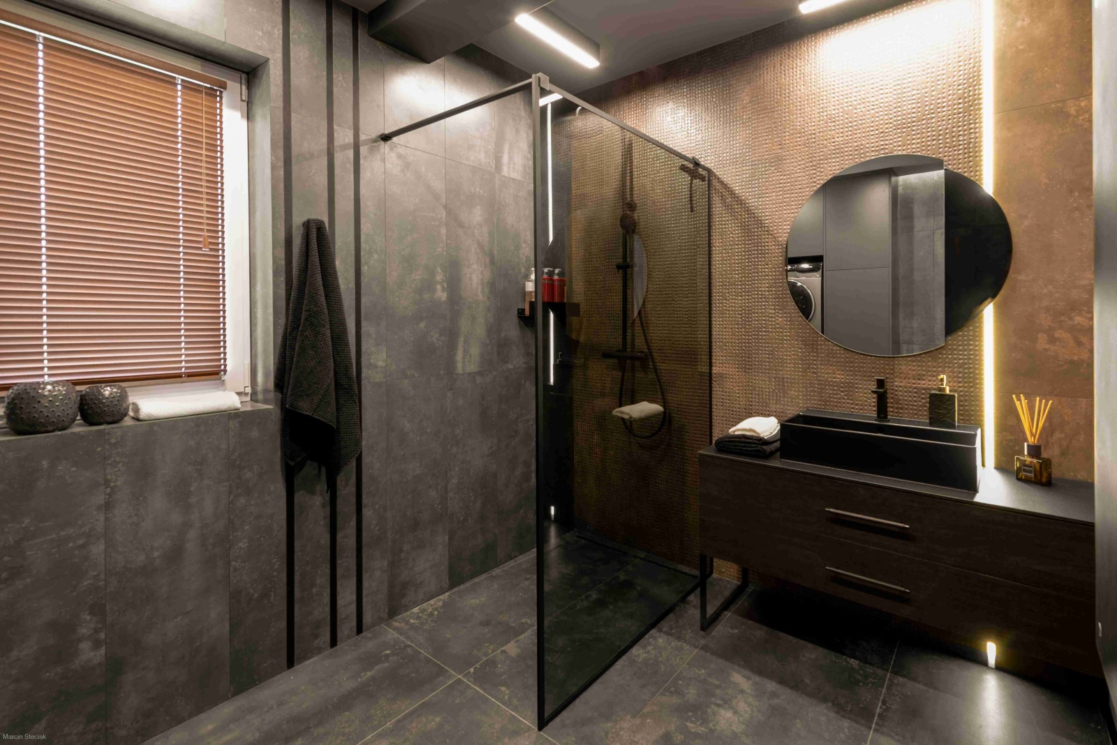 „Bardzo lubię w tym projekcie łazienkę. Znowu zaskoczenie kolorystyczne, bo tu poza szarościami, mamy brązy i odcienie miedziane, które osobiście bardzo lubię. Ciekawie przełamują monotonie we wnętrzu, o którą nietrudno, gdybyśmy postawili tylko na ciemne kolory” mówi Barbara Steciak. „Przemyślane rozwiązania, takie jak prysznic, umywalka oraz pralka z suszarką, zapewniają pełen komfort użytkowania, a dodatkowo zaprojektowano tu dużo miejsca do przechowywania” dodaje.
