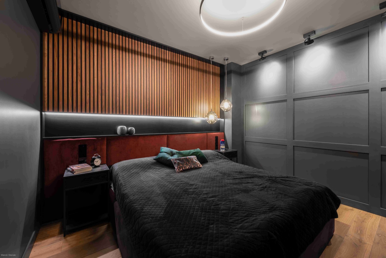 Na piętrze domu znajduje się strefa prywatna – sypialnia, garderoba oraz druga łazienka. Wszystkie pomieszczenia są spójne stylistycznie z przestrzenią na parterze. W sypialni dominuje wielkie łóżko z tapicerowanym zagłówkiem i drewnianymi elementami w postaci lameli. Drewno, czerń i głęboki ceglasty odcień tapicerki, który stanowi ciekawe przełamanie kolorystyczne dla całego pomieszczenia tworzą klimat sprzyjający wieczornemu relaksowi. Wychodząc z sypialni, mijamy garderobę i przechodzimy do przestronnej łazienki.