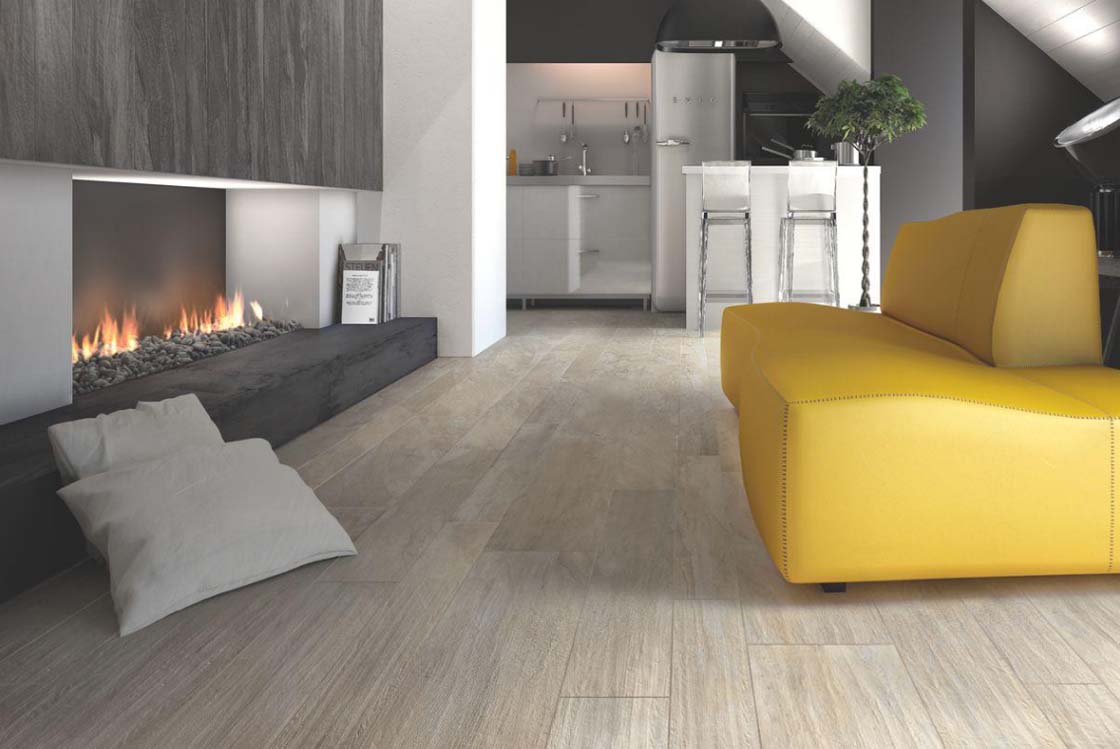 Otwarty z trzech stron kominek stanowi centralny element każdego wnętrza. Jego doskonale wyeksponowane palenisko nie wymaga przesadzonej oprawy. Dlatego do jego obudowy sprawdzą się wszelkiego rodzaju płytki o delikatnych wzorach, na przykład imitujące drewno o wybielonych odcieniach z kolekcji Planks. Pasują one do każdego stylu wnętrza, wprowadzając eleganckie i wyrafinowane akcenty. Dostępne są w pięciu kolorach – Bianco, Beige, Muschio, Bruno i Grigio – oraz w czterech rozmiarach i grubości 6,5 mm.