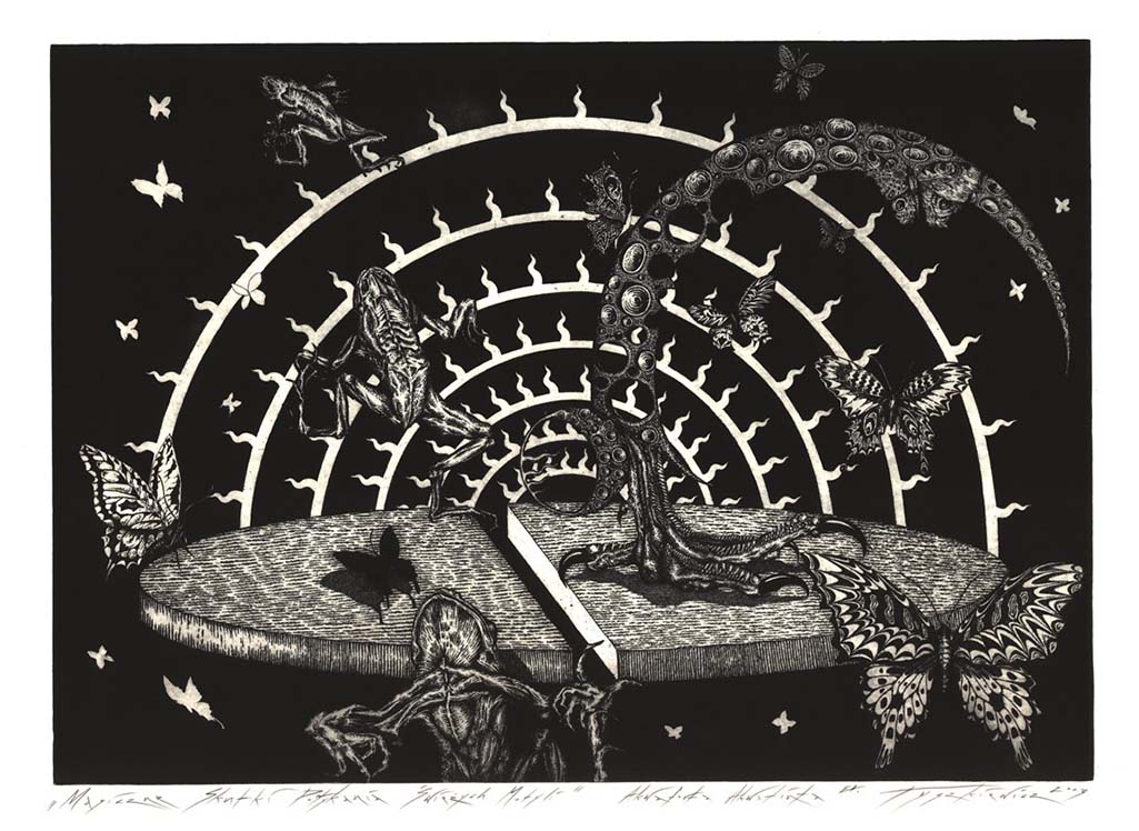 „… grafiką zajmuję się od 16 roku życia. Miedzioryt, akwaforta, mezzotinta, akwatinta - wiem o nich wszystko” - Przemysław Tyszkiewicz od dawna stosuje klasyczne, szlachetne techniki wklęsłego druku. Obdarzony silną indywidualnością i niezwykłą wyobraźnią jest pomysłodawcą i współzałożycielem oraz bardzo ważnym ogniwem Wrocławskiej Szkoły Grafiki.