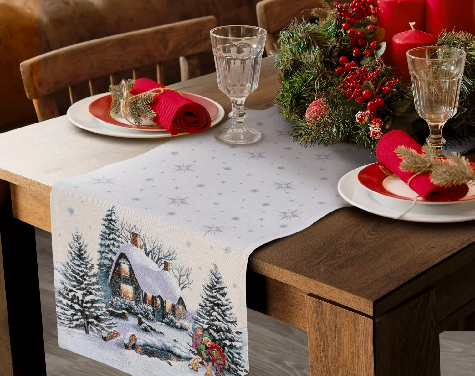 Poszukując inspiracji bożonarodzeniowych, które pomogą Ci przygotować wnętrza na święta, nie zapomnij o wzornictwie: zimowe nadruki na poduszkach czy dekoracyjne bieżniki i obrusy to idealny sposób na podkreślenie gwiazdkowego nastroju w całym domu. Na fotelach, sofach czy łóżkach wyeksponuj poduszki ze świątecznymi napisami. Do klasycznych wnętrz wybierz jednokolorowe poszewki lub te z nastrojowymi wzorami śnieżnych krajobrazów. W pomieszczeniach nowoczesnych dobrze sprawdzą się poduszki o geometrycznych nadrukach z reniferami czy napisami. Swobodnie dobieraj wzory, które najlepiej odpowiadają Twoim gustom. Nie zapomnij też o oprawie stołu – to przecież wokół niego skupiają się święta. Eleganckie obrusy z delikatnymi wzorami gwiazd lub dodatkiem połyskujących nitek zapewnią wyjątkową ozdobę. Dodaj do tego dekoracyjny bieżnik – rozpostarty wzdłuż blatu, stanowić będzie ciekawą kontrę kolorystyczną.